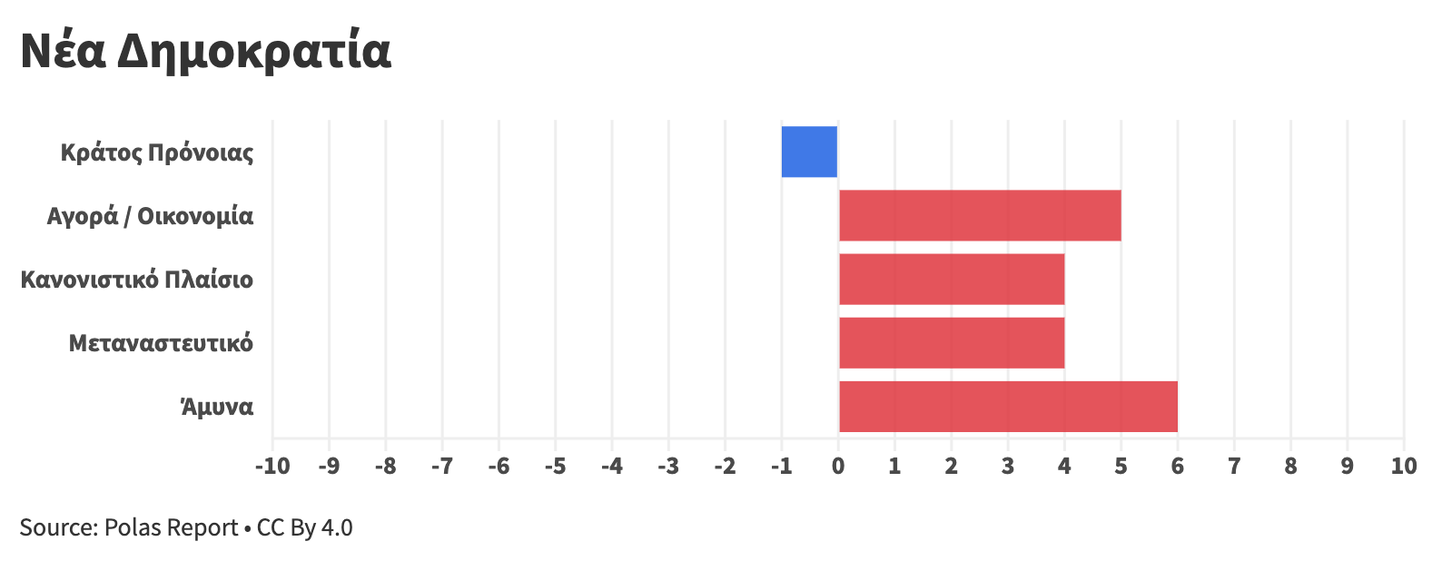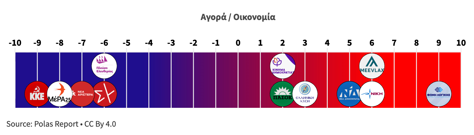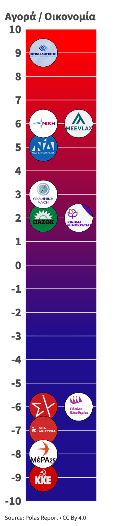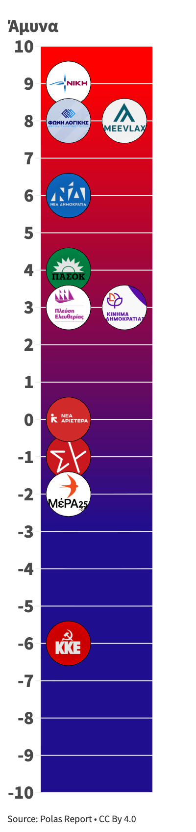Κάθε άξονας βαθμολογείται σε κλίμακα –10 έως +10, με τεκμηριωμένη ανάλυση για κάθε κόμμα και θεματική ενότητα.