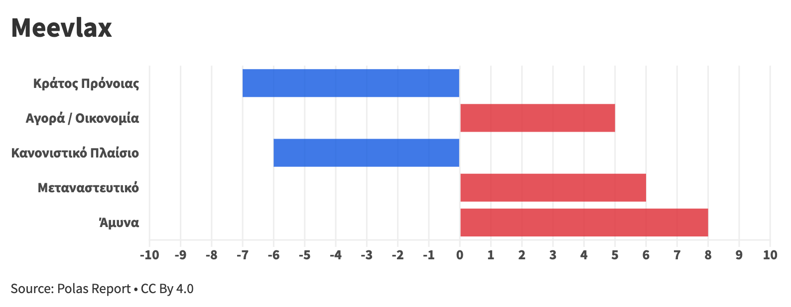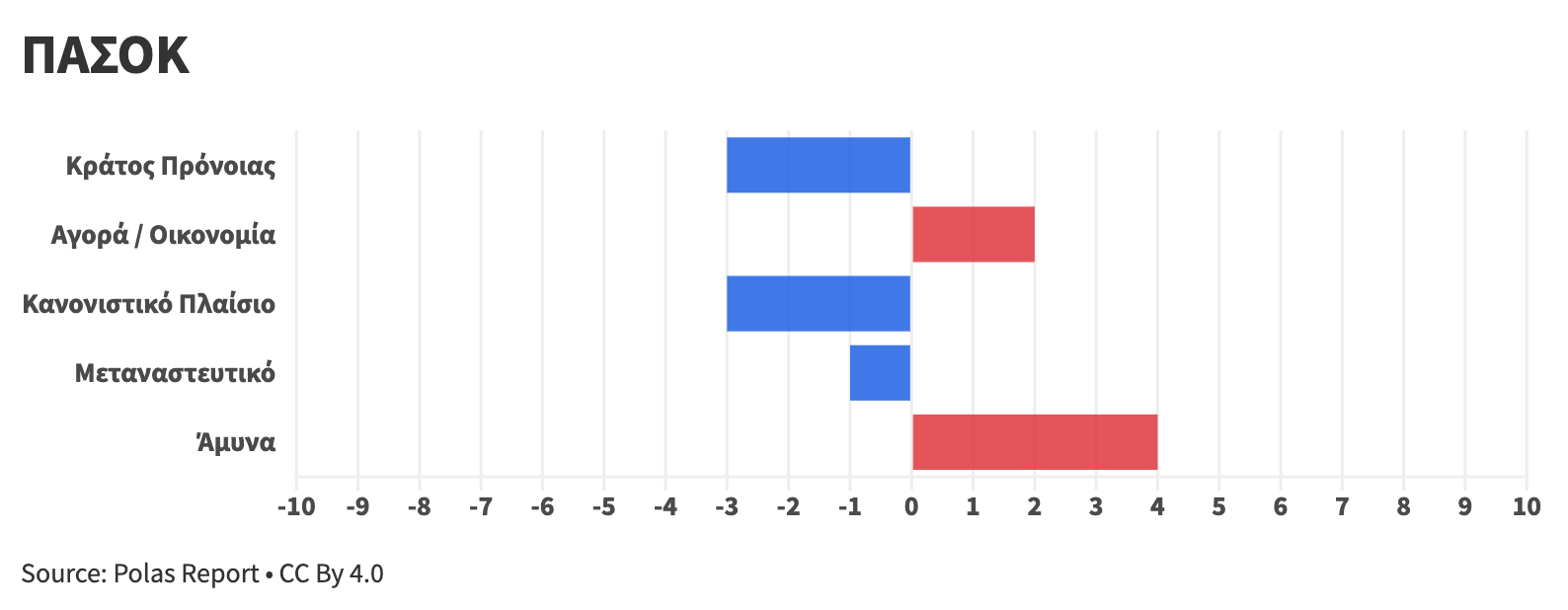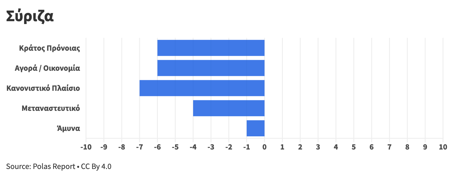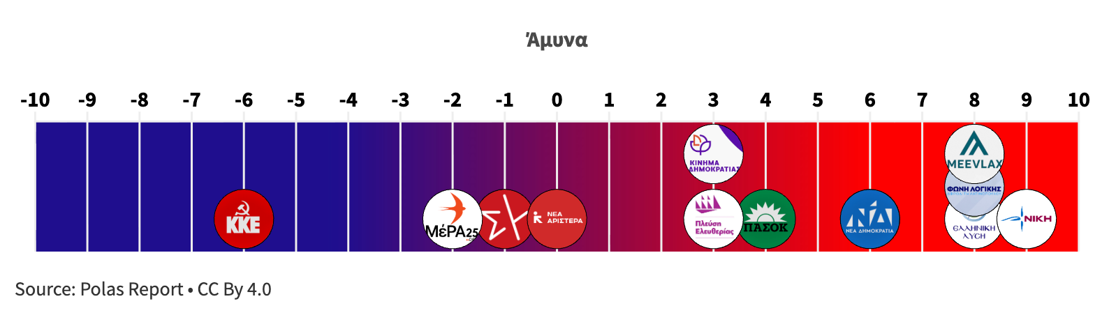 Κάθε άξονας βαθμολογείται σε κλίμακα –10 έως +10, με τεκμηριωμένη ανάλυση για κάθε κόμμα και θεματική ενότητα.